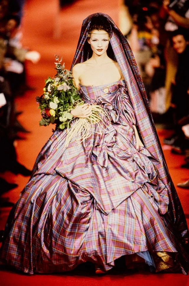 And then came the drama: Anglomania. Spring/Summer 1993 gave us Kate Moss as an anti-bride, floating down the runway clutching a bouquet like a weapon of seduction. That corseted ivory dress? A Rococo dream with a Sex Pistols twist—history and anarchy dancing cheek-to-cheek. And let’s not forget the fully patterned toile-on-toile explosion: exaggerated hips, corset cinching, and satire sewn into every stitch. Only Vivienne could make aristocracy look like it just discovered punk rock.